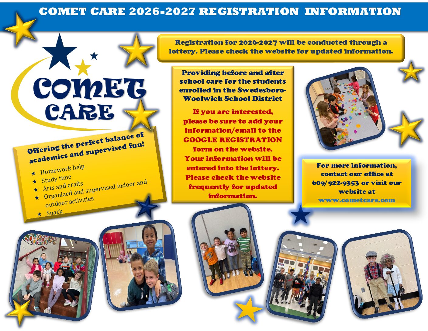 The Comet Care program is a tuition-based before and after school program that provides a safe, affordable and nurturing environment to the residents of Swedesboro and Woolwich Township. While at Comet Care, children will have the opportunity to participate in a variety of activities including outdoor play, crafts, games and homework time. Comet Care is for the children who will attend grades Kindergarten through Grade 5.